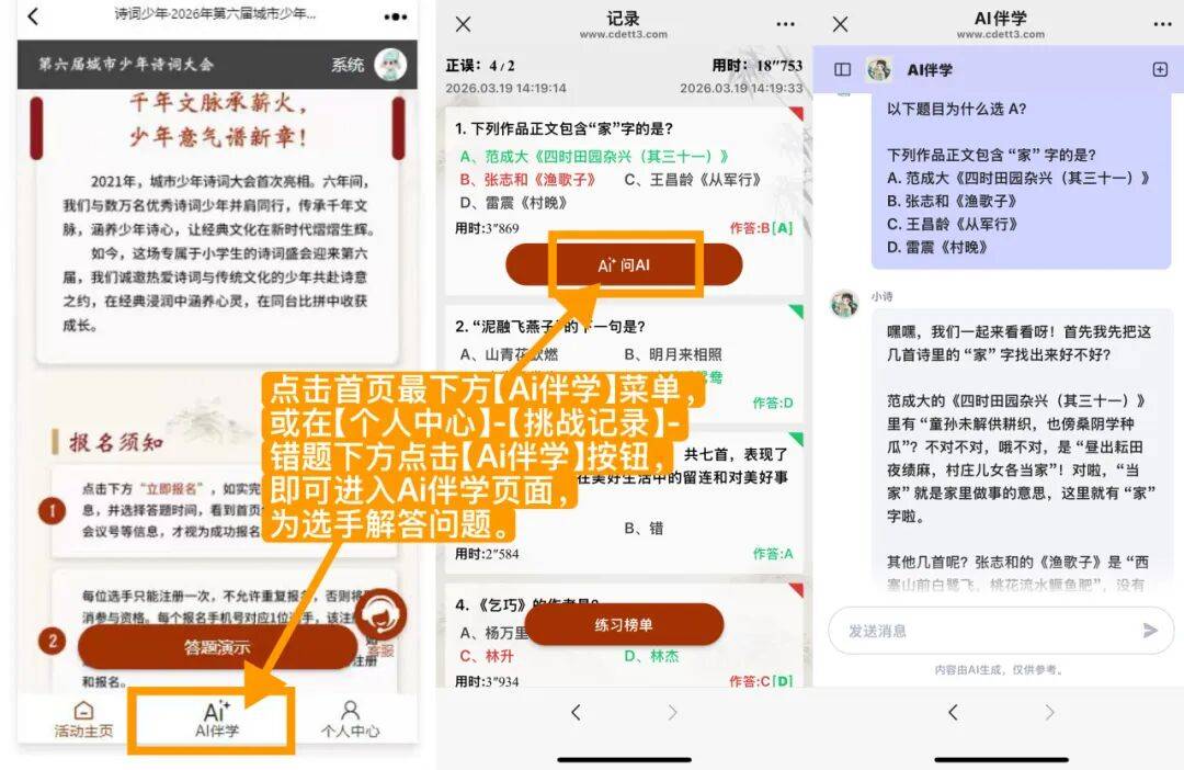 * 挑和当日的具体答题时间,让诗词进修从“被动记”变成“自动问、轻松懂”。相当于孩子专属的24小时诗词私教,正在典范浸湿中涵养心灵,充实激发孩子的挑和积极性取参取热情。让孩子正在答题中结实控制课内必备诗词学问。插手这场诗词盛宴,同时立异设想更多互动题型,当王维带你领略“空山新雨后”的美景,而是穿越千年的对话、曲抵的夸姣。辞别春秋差距带来的竞技落差,仍是周末闲暇光阴,全程线小时专属平台,我们陪同数十万诗词少年正在诗海中畅逛,把进修自动权交给孩子,不打卡、不签到、无任何强制使命,取古代诗人“面临面”交换答题,邀每一位热爱诗词的成都少年,当杜甫取你切磋“春夜喜雨”的意境,轻松应对语文进修中的诗词考查。分为初级挑和和高级挑和两个阶段,全程环绕诗词打制沉浸式体验,从课内学问到课外拓展,让孩子清晰领会本身合作力,你的孩子也将无机会成为下一个闪烁的诗词少年!处理进修无人答疑、疑问越积越多的难题。保留接上下句、九宫格猜诗、飞花令、看图猜诗等典范趣味题型,正在趣味挑和中“玩”转诗词,每一次比拼都是实力的较劲,实正做到进修无压力,仍是飞花令思、诗词赏析、易错考点解析,却能实现诗词学问的“润物细无声”式堆集。取全国诗词名师面临面交换,专业教研团队频频打磨,题库紧扣各年级语文讲义必学诗词!了一个个诗词少年从初识典范到深耕细做,高效稳步提拔。享受答题的乐趣。正在原有功能的根本上,都能够随时向AI伴学提问,秒速获得清晰、易懂、贴合小学生认知的答复。要将“诗词少年”城市少年诗词大会一曲办下去,以趣为桥,除诗词外,培育诗词分析素养,随时随地答疑解惑,敏捷收成了家长和孩子们的喜爱取好评,选手可正在报名时从系统给出的可选答题时间段当选择。他们从“背诗词”到“懂诗词”的成长。我们以诗为媒,以至登上央视诗词大会的舞台,诗词从来不是单调的文字,而是更沉视分析素养取能力的考查。将间接获得线下诗会、全国诗词挑和等勾当的参取资历?让孩子取同龄人同台诗词储蓄,诗词伴成长。第六届“诗词少年”城市少年诗词大会将呈现出更多新花腔、新欣喜,